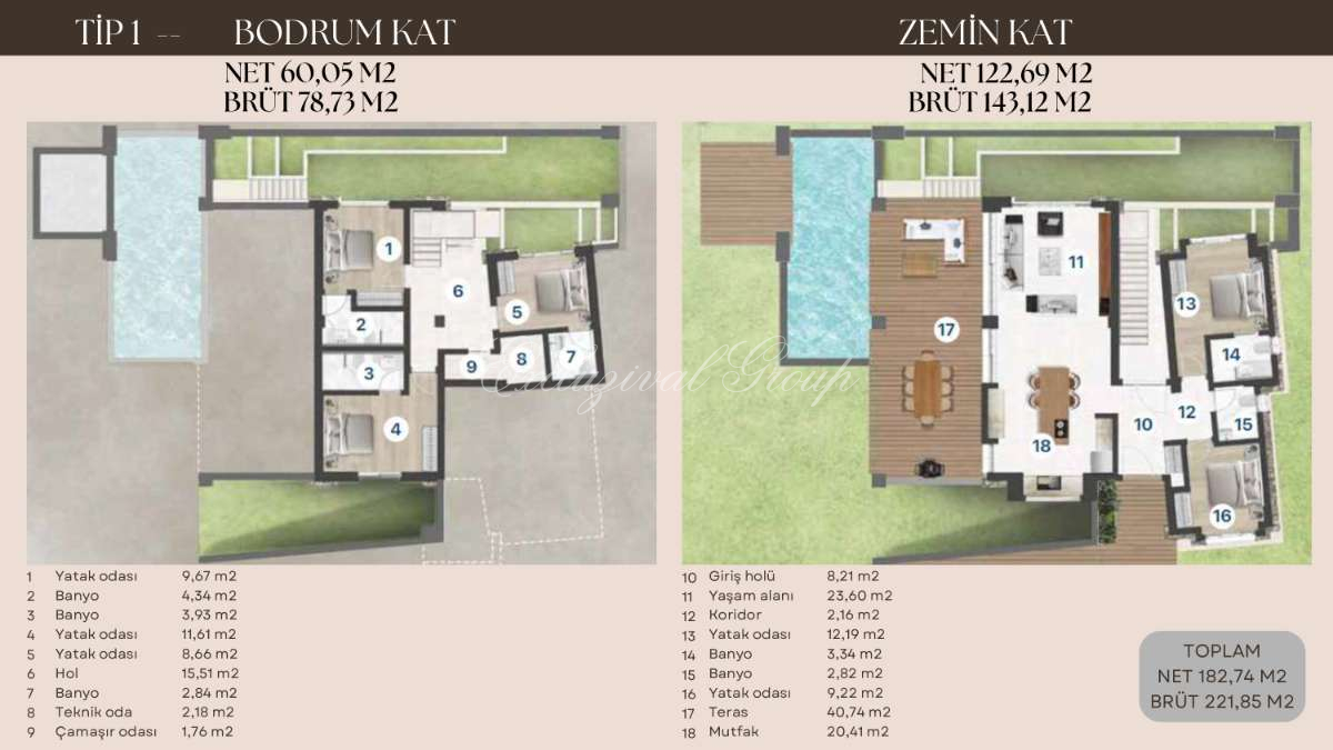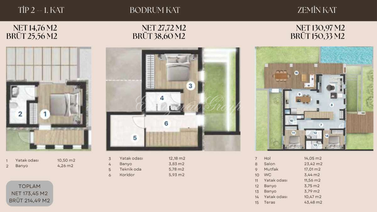 Шесть вилл 4+1 (брутто 214,49 м², нетто 173,45 м²) и десять вилл 5+1 (брутто 221,85 м², нетто 182,74 м²) – каждая создана с исключительным вниманием к деталям. Ваше личное пространство будет расширено собственным садом площадью от 850 до 1600 м², где вы сможете наслаждаться свежим воздухом, а также собственным бассейном, который станет центром летних развлечений.