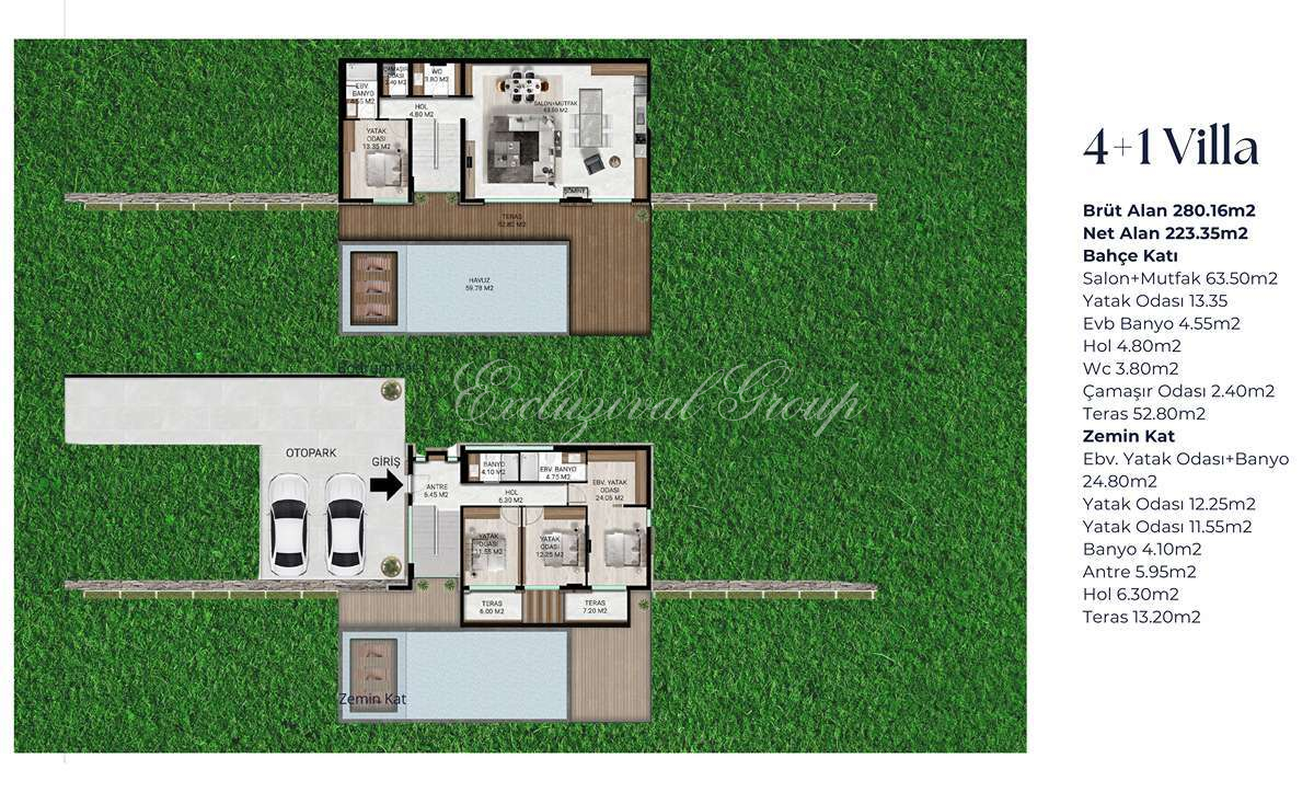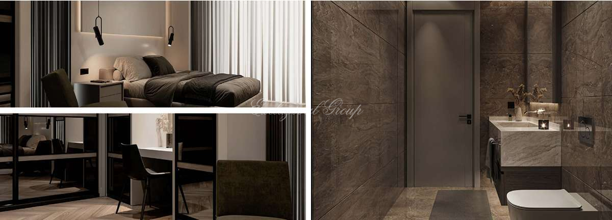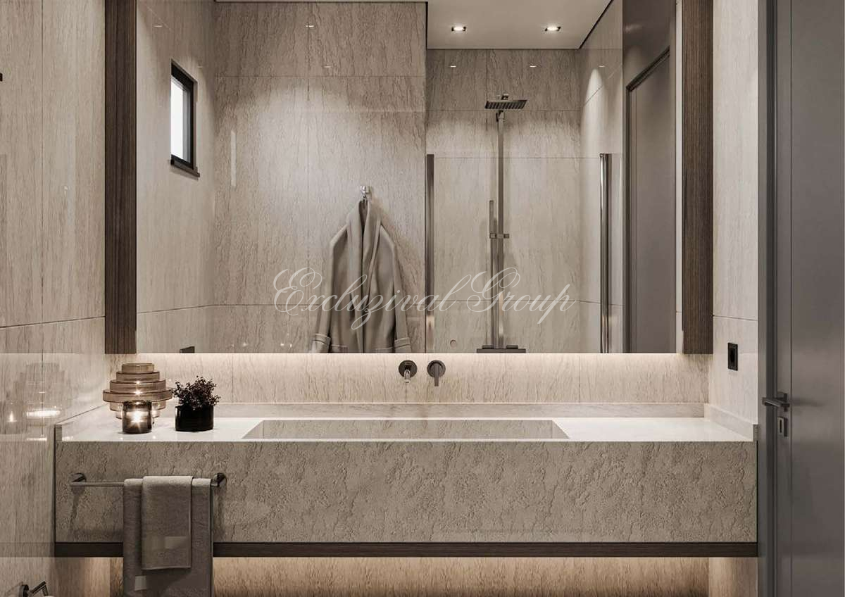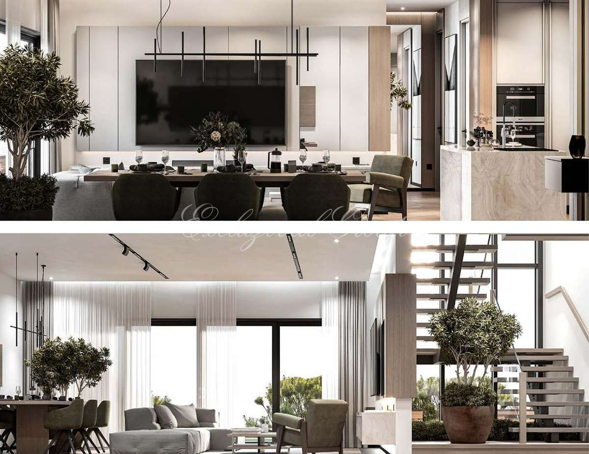 50 стильных частных вилл спроектированы по двухуровневой концепции. На нижнем этаже — гостиная, кухня и одна спальня; на верхнем — три спальни для максимального комфорта. Общая площадь брутто — 280,16 м², нетто — 223,35 м². Высота потолков достигает 2,93 метра, наполняя интерьеры светом и воздухом.