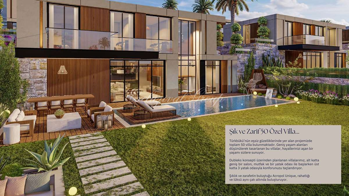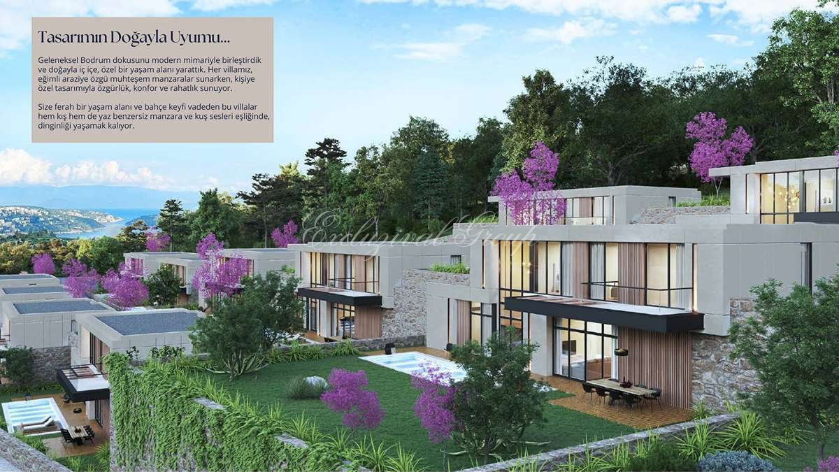 Собственный бассейн 36 м², отдельная парковка для каждой виллы и гостевая парковка, система «умный дом» и подогрев полов — все это создано для безупречного быта. В 11 км — яхтенная марина Ялыкавак, в 16 км — исторический центр Бодрума, а аэропорт находится всего в 45 км. При этом сам район, известный своими тихими бухтами и элитной инфраструктурой, дарит ощущение полного уединения среди холмов, покрытых соснами и оливковыми деревьями.
